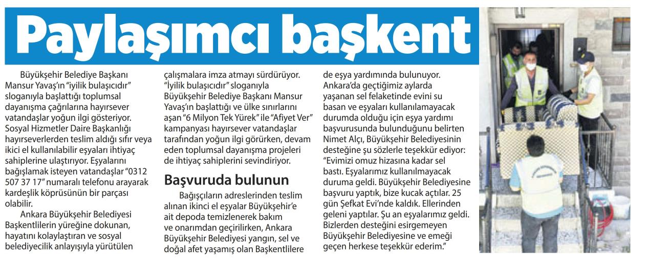 Ankara büyükşehir belediyesi 2013 yılından bu yana sığınmaevinden ayrılan bağımsız hayata geçiş sürecinde olan kadınlara 7 yıldır hizmet veren eşya bankası projesi ile destek olmaktadır. Ankara büyükşehir belediyesi tarafından 2013 yılında başlatılan kampanya kapsamında şiddet mağduru kadınların yeni bir hayat kurmalarını sağlamak amacı ile evinde ihtiyaç fazlası ikinci el eşyası olan kişilerden bu eşyaları toplamaya başladı. 312 431 62 20 431 62 24. Ankara büyükşehir belediye başkanı mansur yavaş ın başlattığı i̇yilik bulaşıcıdır hareketi eşya dayanışmasıyla yeniden gündem oldu.