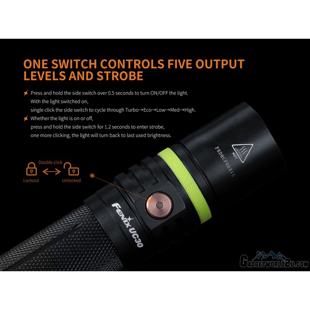 Tek 18650 pil ile maksimum çıkış sağlayan el feneri açık ve kapalı alanlarda profesyonel kullanım için ve günlük kullanım ihtiyacını karşılamak için flaş modu dahil olmak üzere beş farklı çıkış gücü bulunmaktadır. Fenix uc30 2017 çok sevilen uc30 için bir güncellemedir. 15 gün içinde ücretsiz iade detaylı bilgi için tıklayın. Yeni geliştirilen fenix uc30 yeniden şarj edilebilir el feneri 1000 lümen maksimum çıktı sağlayan bir cree xp l hi led ve bir adet şarj edilebilir 18650 li ion pil ile güçlendirilmiş 830 fit kiriş mesafesine 253m sahiptir.